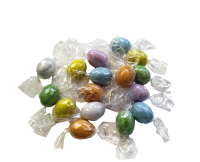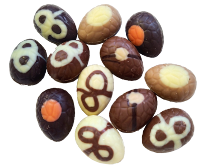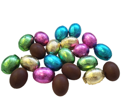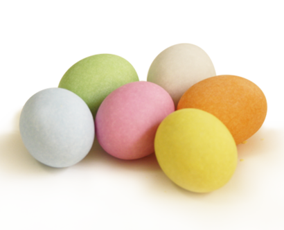 Um dos formatos mais genuínos e clássicos da Páscoa: os mini-ovos de chocolate preto com recheio de creme de avelãs mas drageados com uma finíssima capa de açúcar em 6 tons de cor cores irresistíveis: amarelo, rosa, azul claro, verde claro, branco e laranja. Podem ser fornecidos não embrulhados ou embrulhados em película neutra transparente de duplo laço. Um dos produtos mais apetecíveis em que é mesmo difícil comer um só…